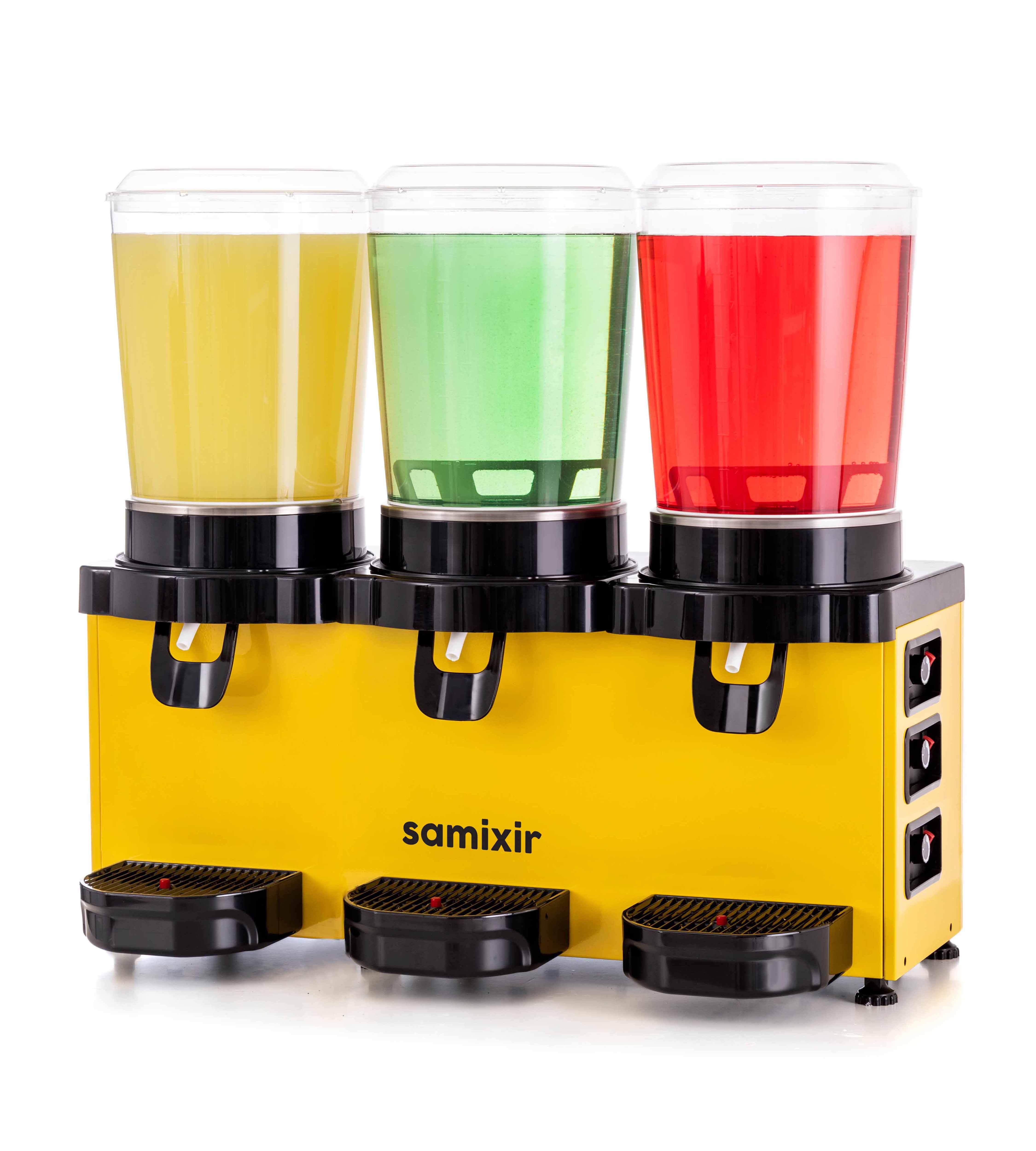 Countertop cold beverage dispenser with yellow base, ideal for natural fruit juices, ayran, and cold drinks. Fast and even beverage cooling to the last drop with large cooling base, saving up to 50% energy.
