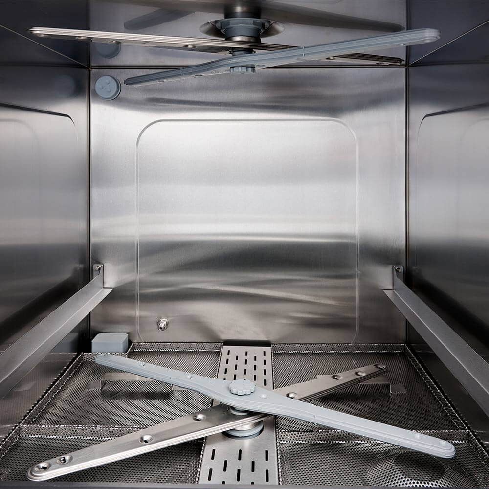 The professional dishwasher features a modern design, equipped with a steaming function and electronic control, being intended for use in the HoReCa sector. The appliance allows precise selection of operating parameters through a clear and durable control panel, inclined appropriately to ensure operator comfort.