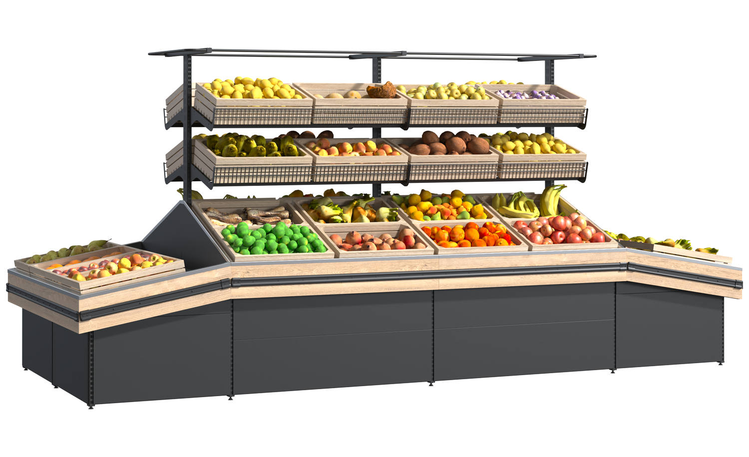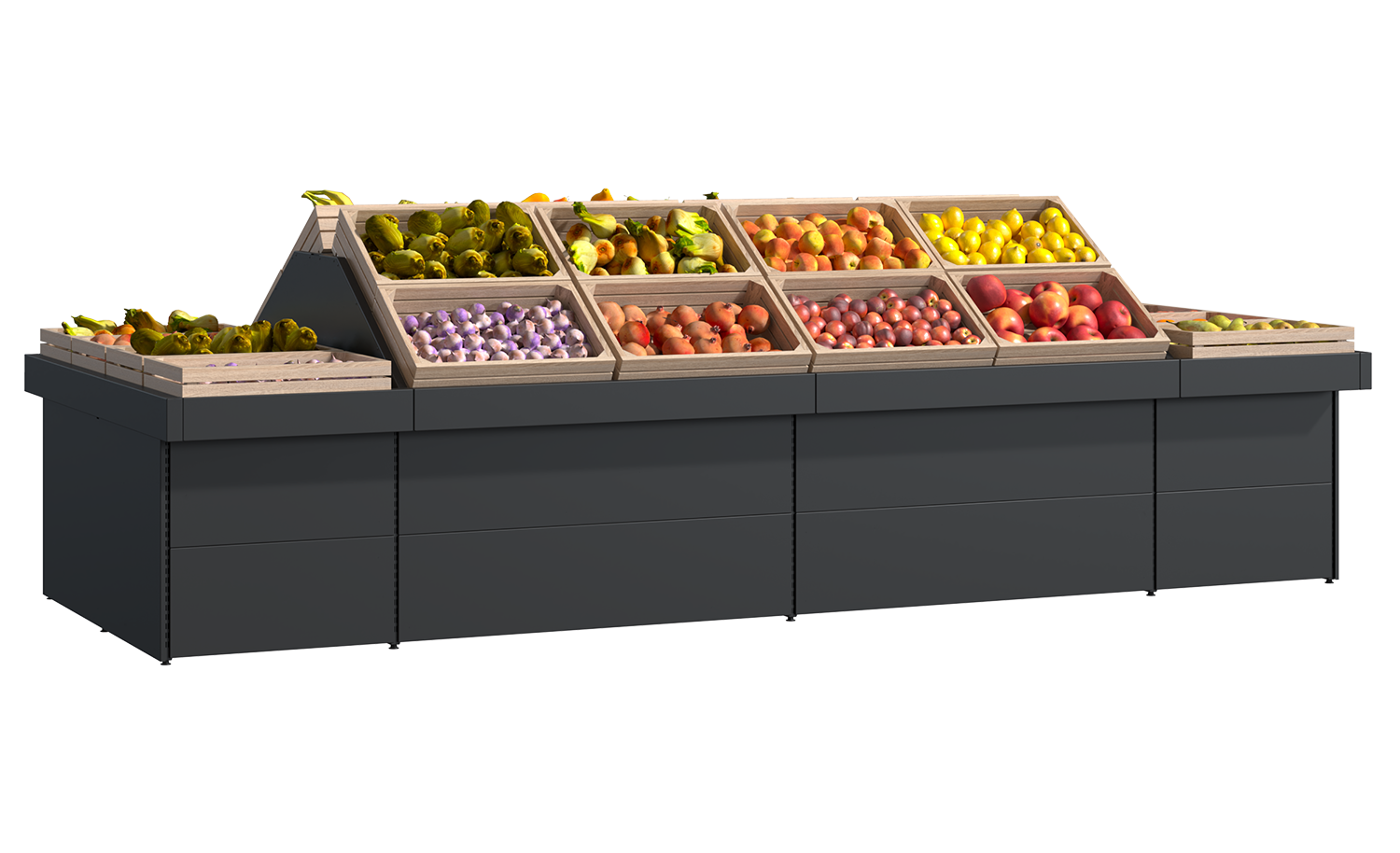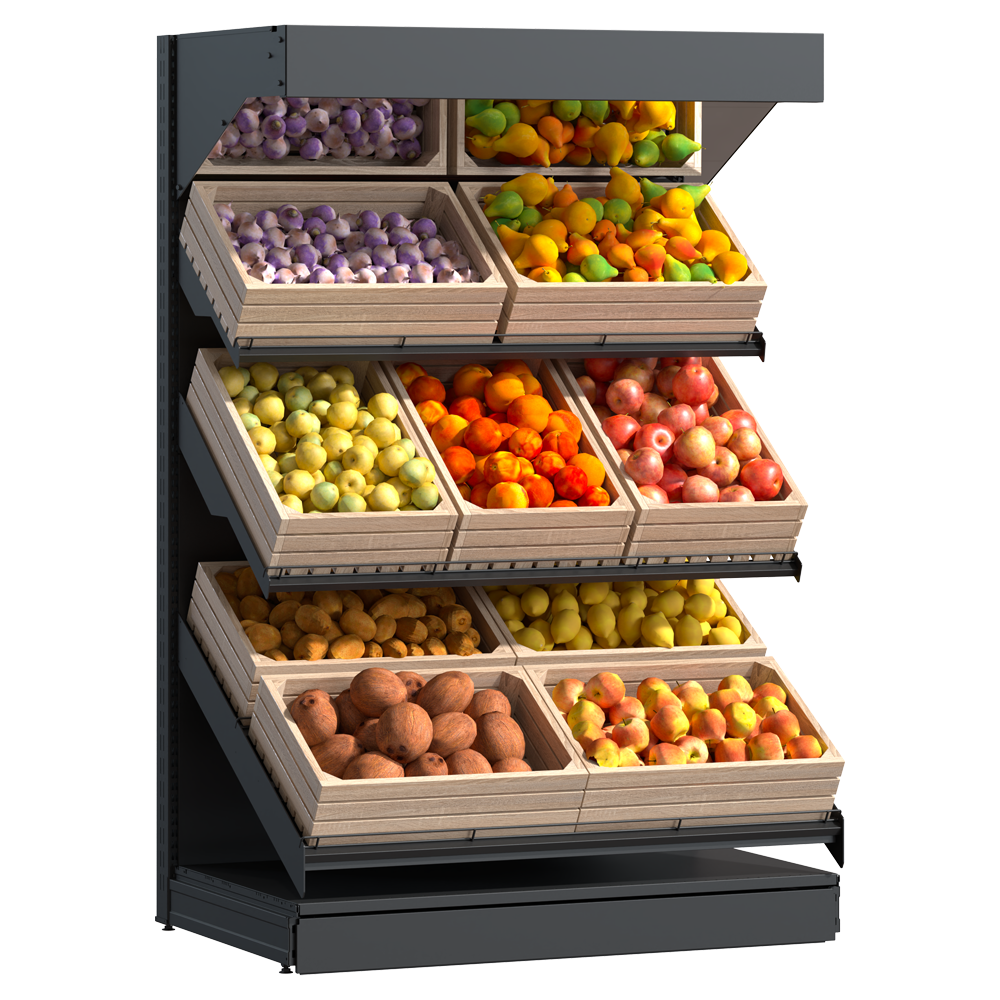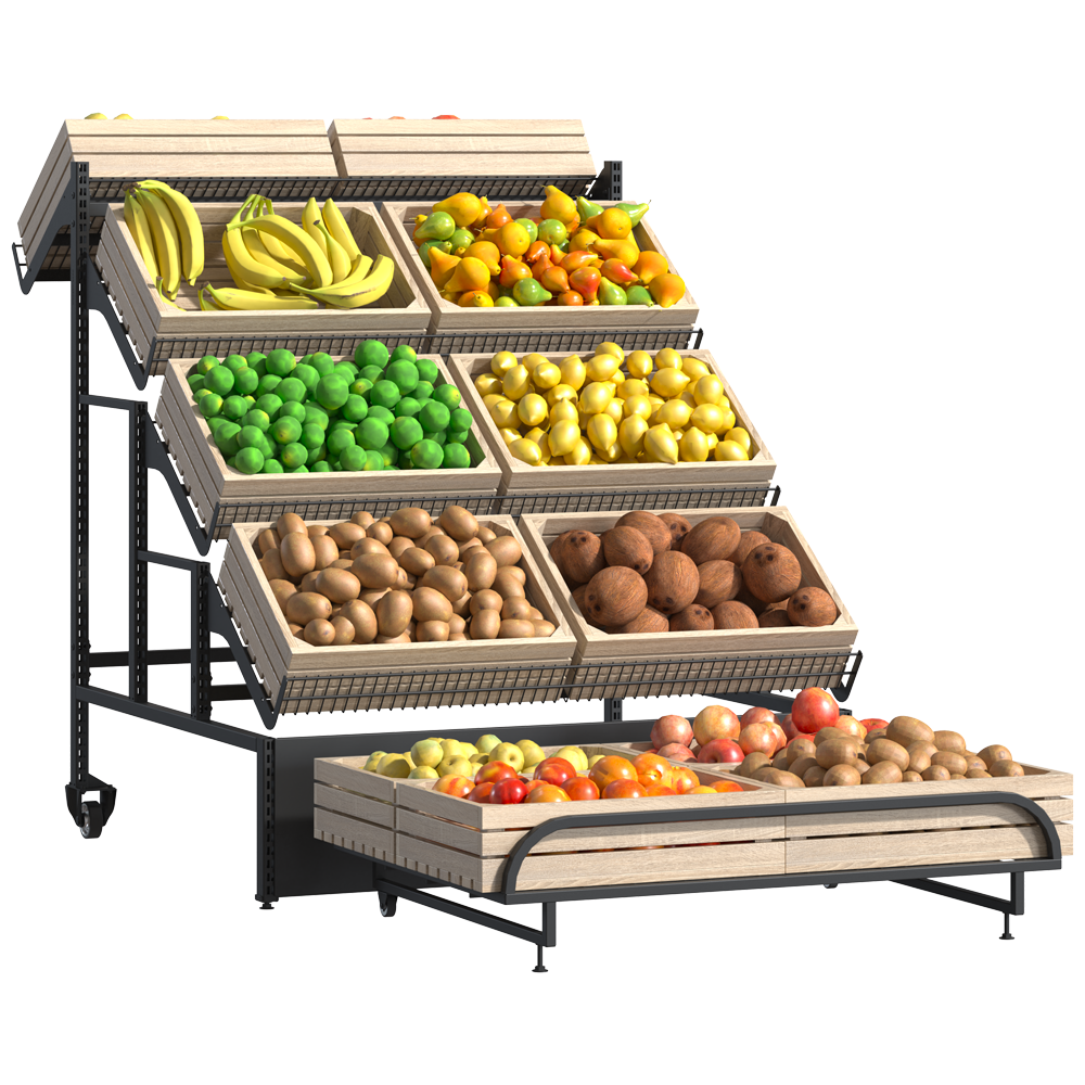 Multi-level display unit with cascade-style frame, designed for efficient presentation of the fruit and vegetable section in stores. Equipped with foldable wire shelves inclined at 15°/35°, integrated crate trolley,and durable metal base. The modular shelf system is compatible with standard wooden crates, offering maximum flexibility in organization.