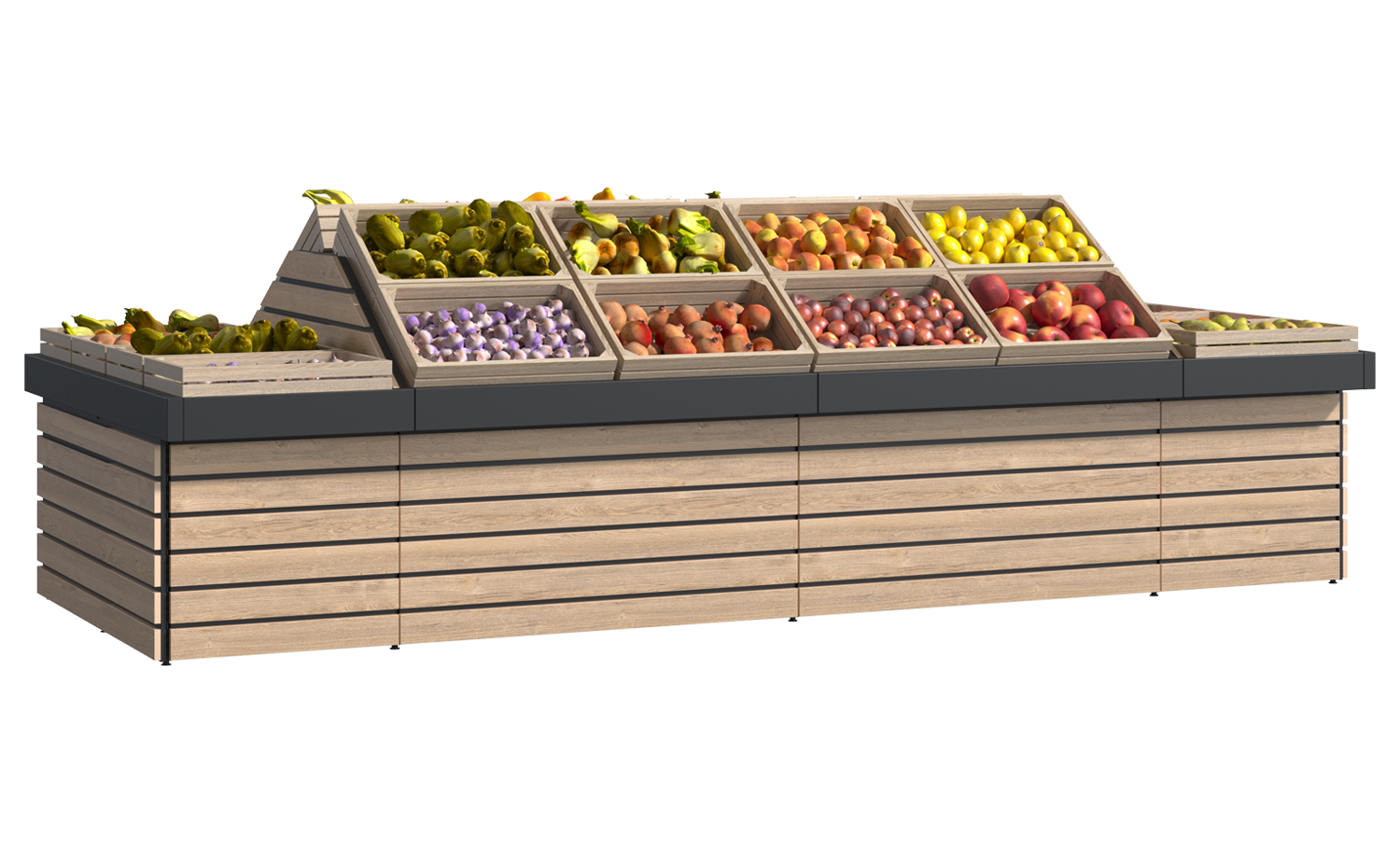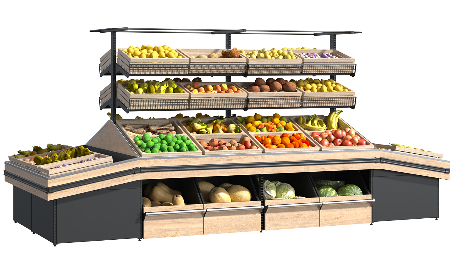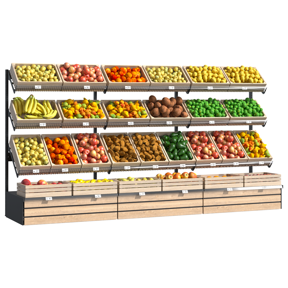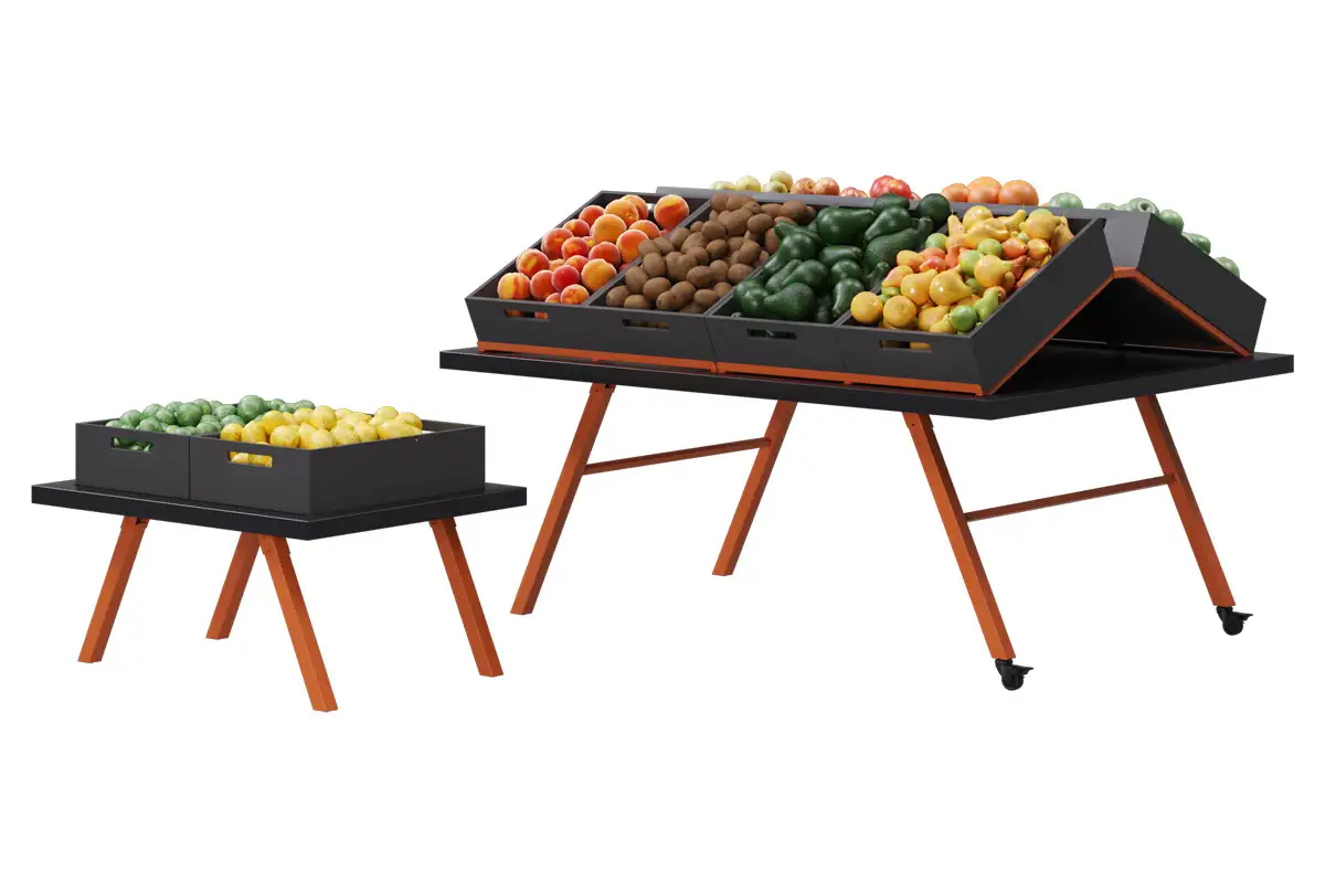 Multi-level display unit with cascade-style frame, designed for efficient presentation of the fruit and vegetable section in stores. Equipped with foldable wire shelves inclined at 15°/35°, integrated crate trolley,and durable metal base. The modular shelf system is compatible with standard wooden crates, offering maximum flexibility in organization.