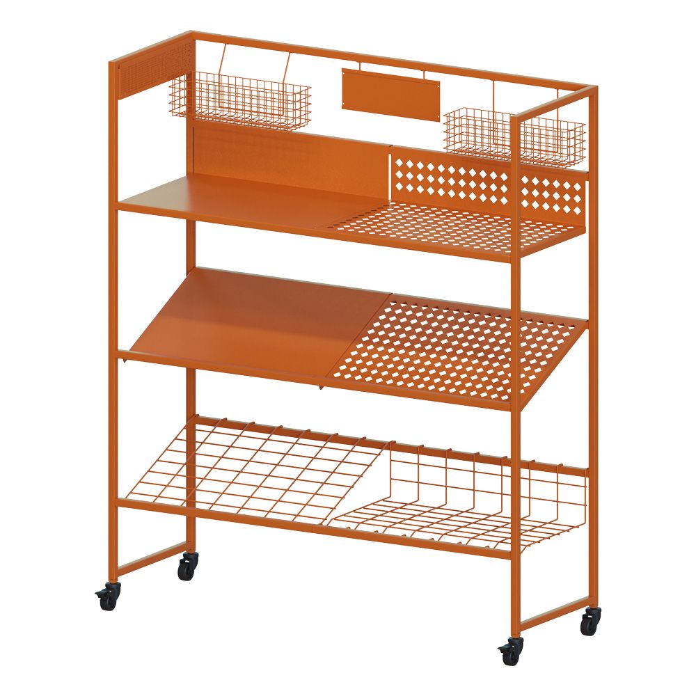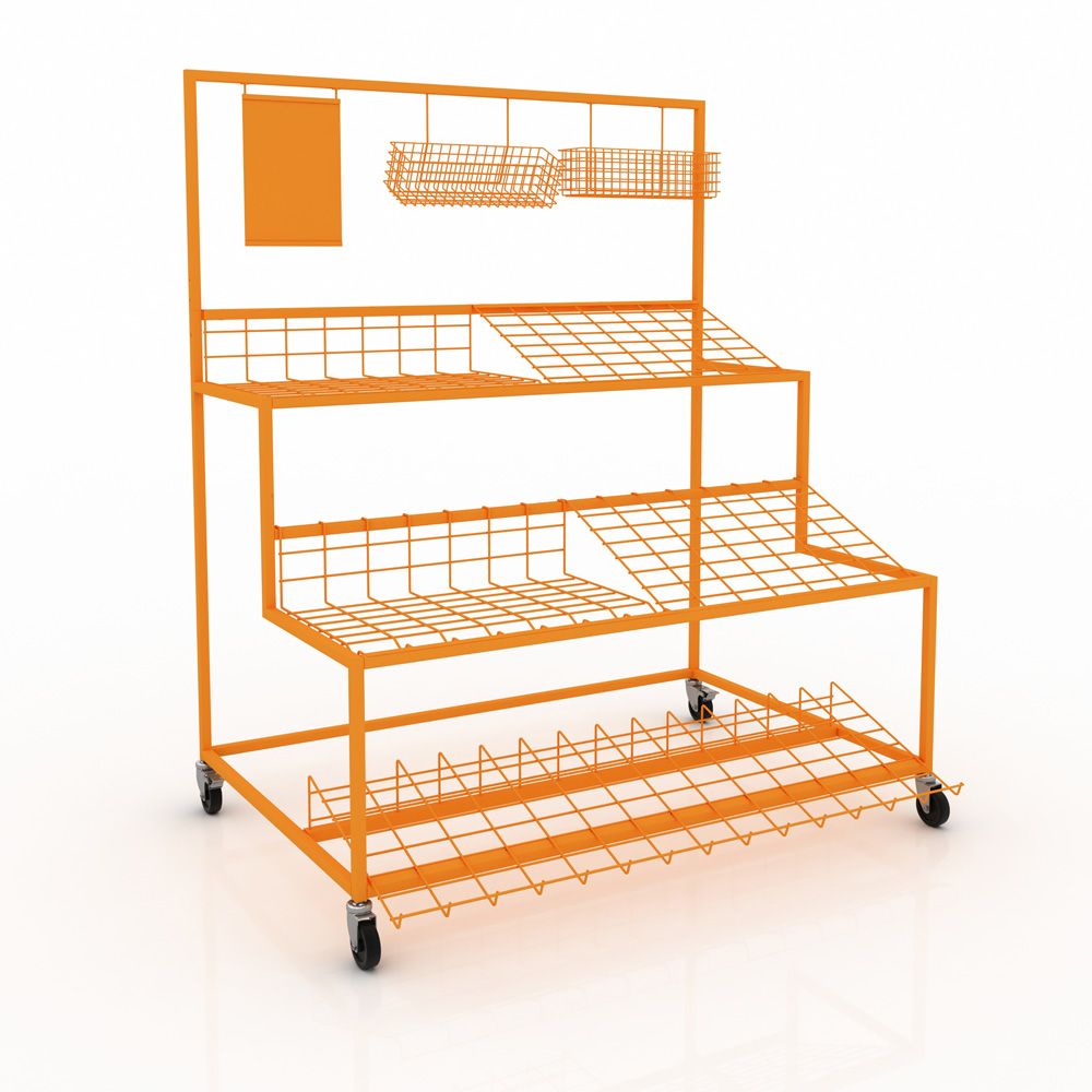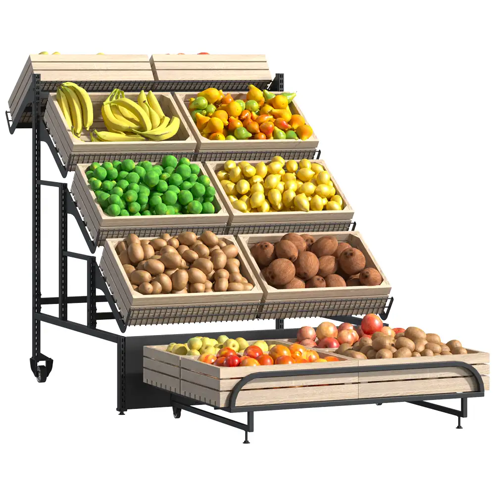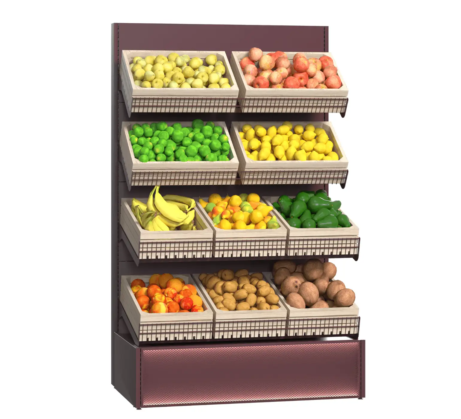 Multi-level display unit with cascade-style frame, designed for efficient presentation of the fruit and vegetable section in stores. Equipped with foldable wire shelves inclined at 15°/35°, integrated crate trolley,and durable metal base. The modular shelf system is compatible with standard wooden crates, offering maximum flexibility in organization.