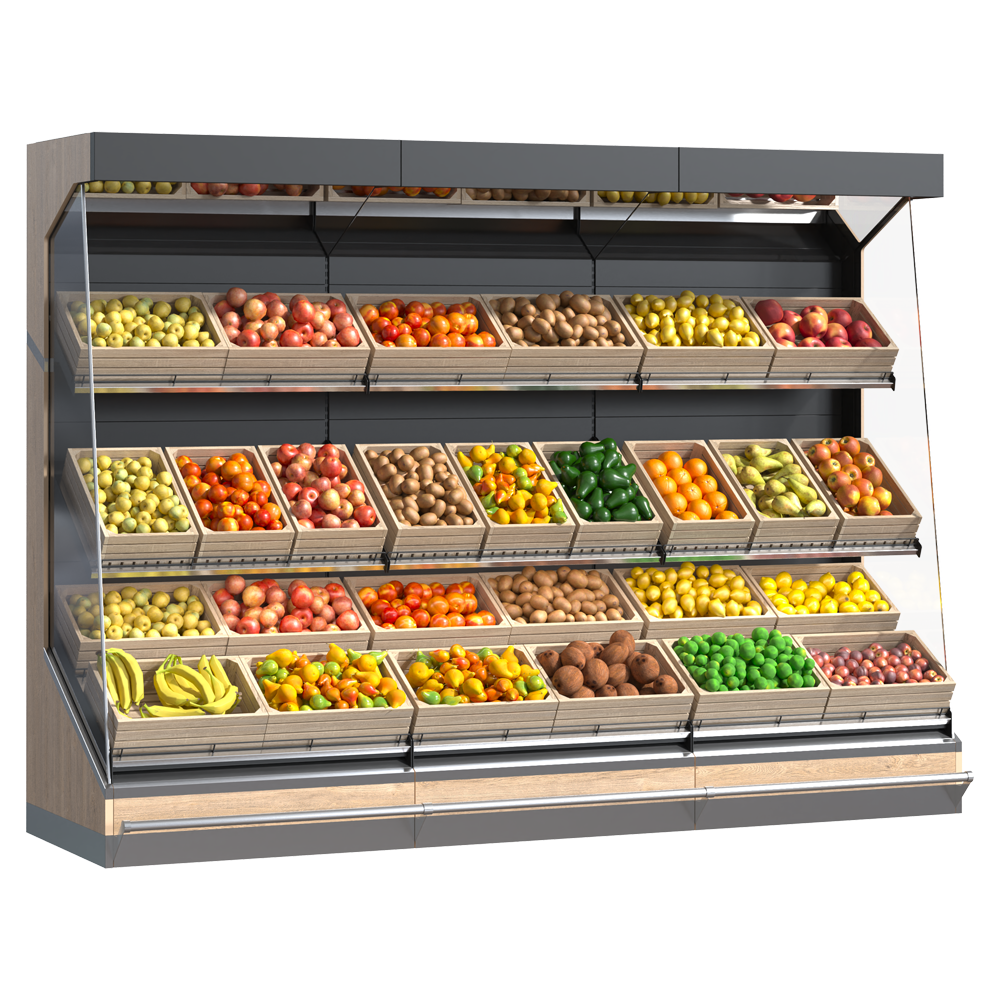 Wall-mounted unit designed for small-format retail, ideal for organizing the fruit and vegetable section in stores. The showcase structure includes foldable wire shelves inclined at 15°/35°, a metal base shelf, metal panels, and a plinth with LED lighting. It is compatible with standard wooden crates and Cooles SlimDeck multidecks. This compact commercial furniture, under 1m², is designed for efficient display of fresh products in limited spaces, suitable for supermarket chains and specialty stores.