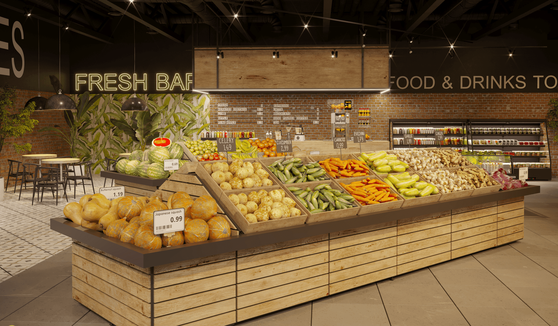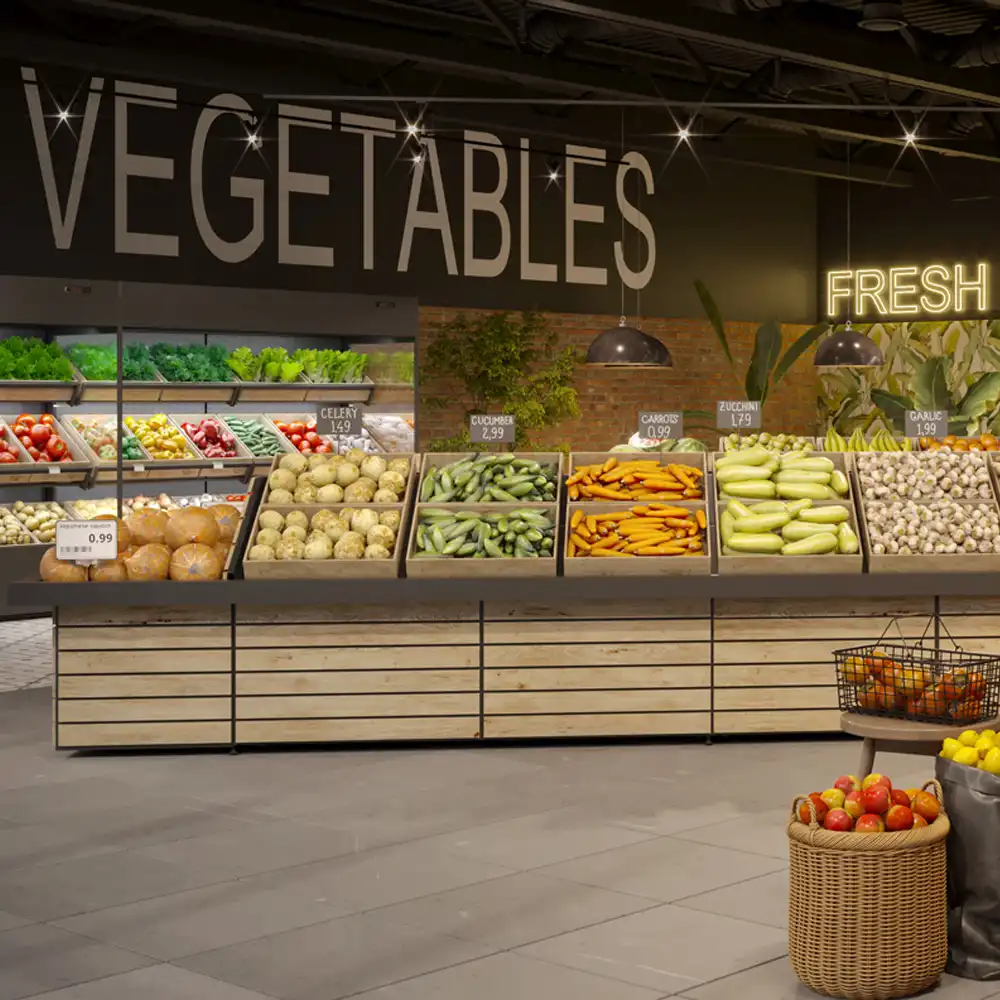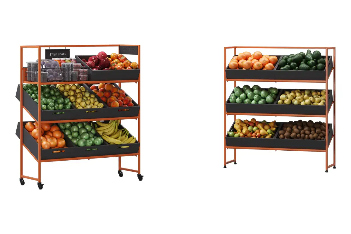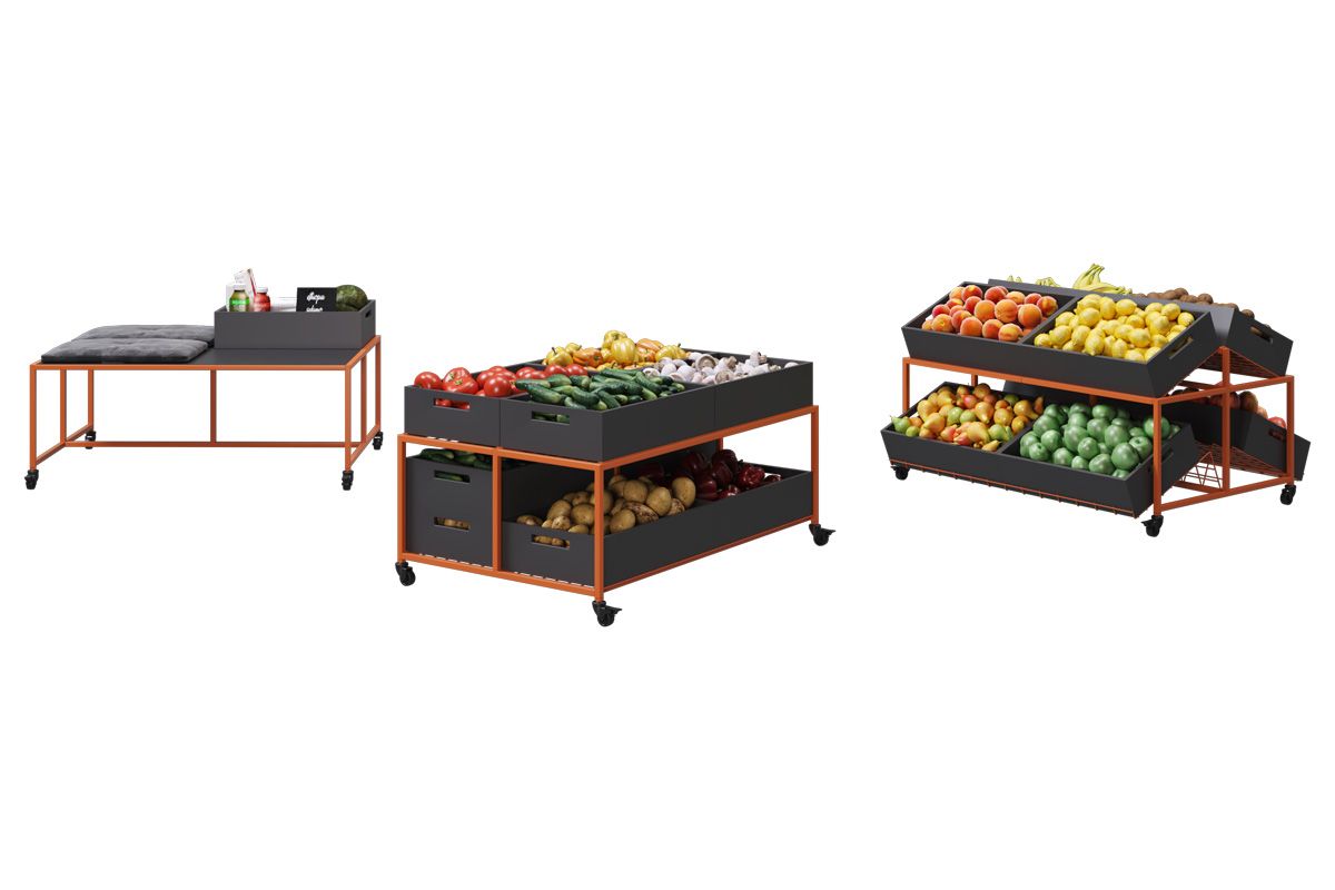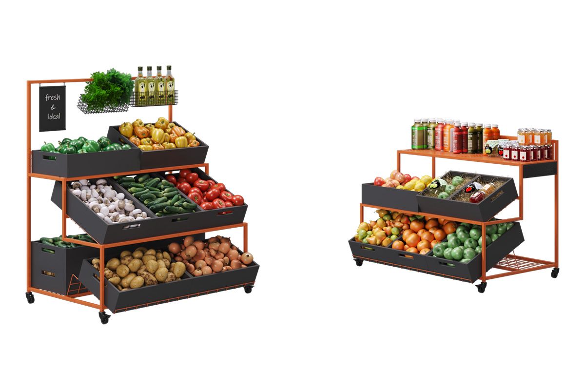 Fruit and vegetable showcases are essential for the efficient display and organization of fresh products in stores, supermarkets or specialized shopping centers. These shelving systems maximize visibility and accessibility, making product selection easier for customers. Durable materials and optimal ventilation ensure ideal conditions for preserving freshness and hygiene of perishable goods, while decorative chipboard elements add a stylish touch and integrate seamlessly into any retail space. All types of fruit and vegetable showcases offered by ViTRA — with inclined or tubular shelves, gondola-style, multi-level, foldable baskets, low platforms, wall-mounted or mobile units — enhance the overall appearance of the area, attract customers and boost sales through attractive and well-organized presentation.