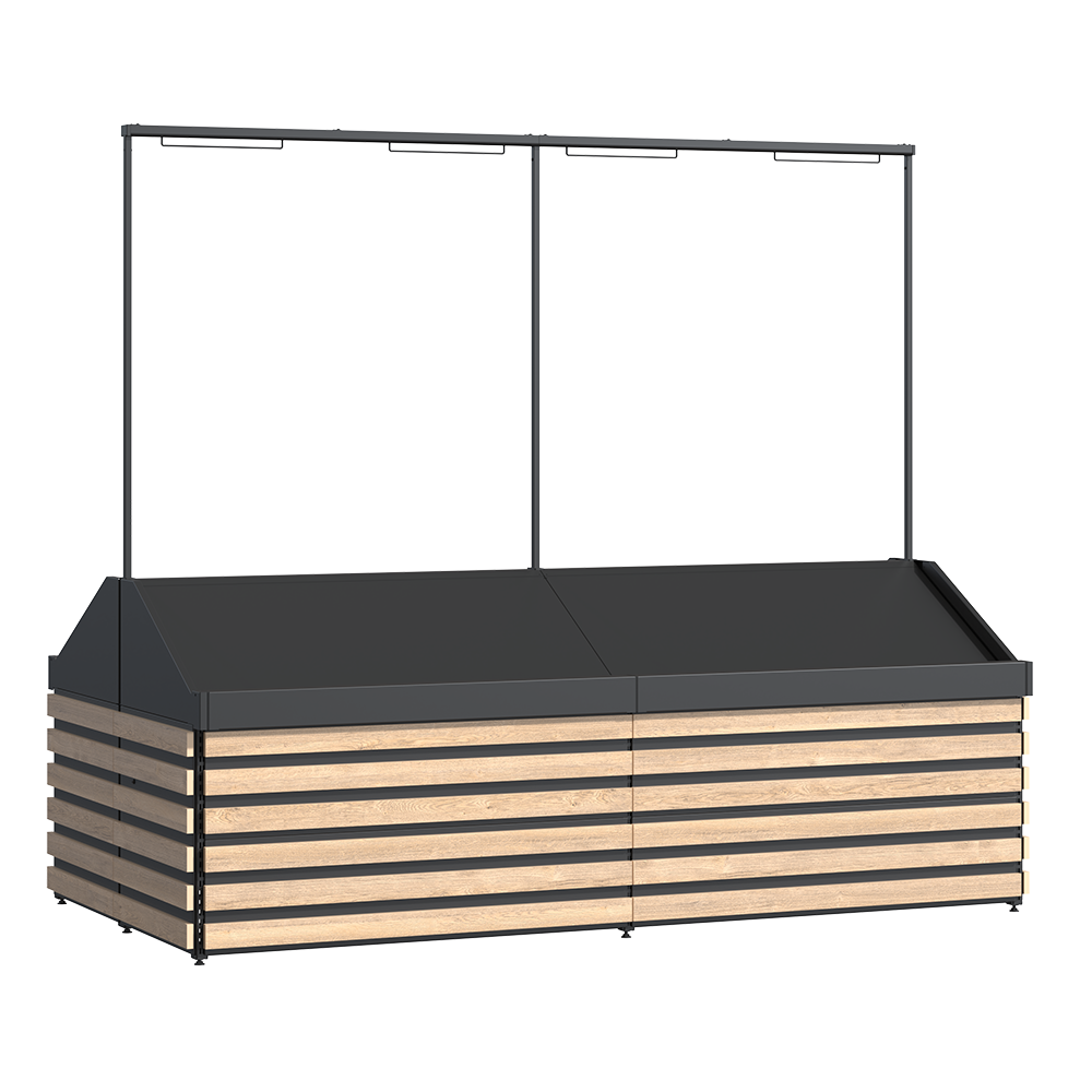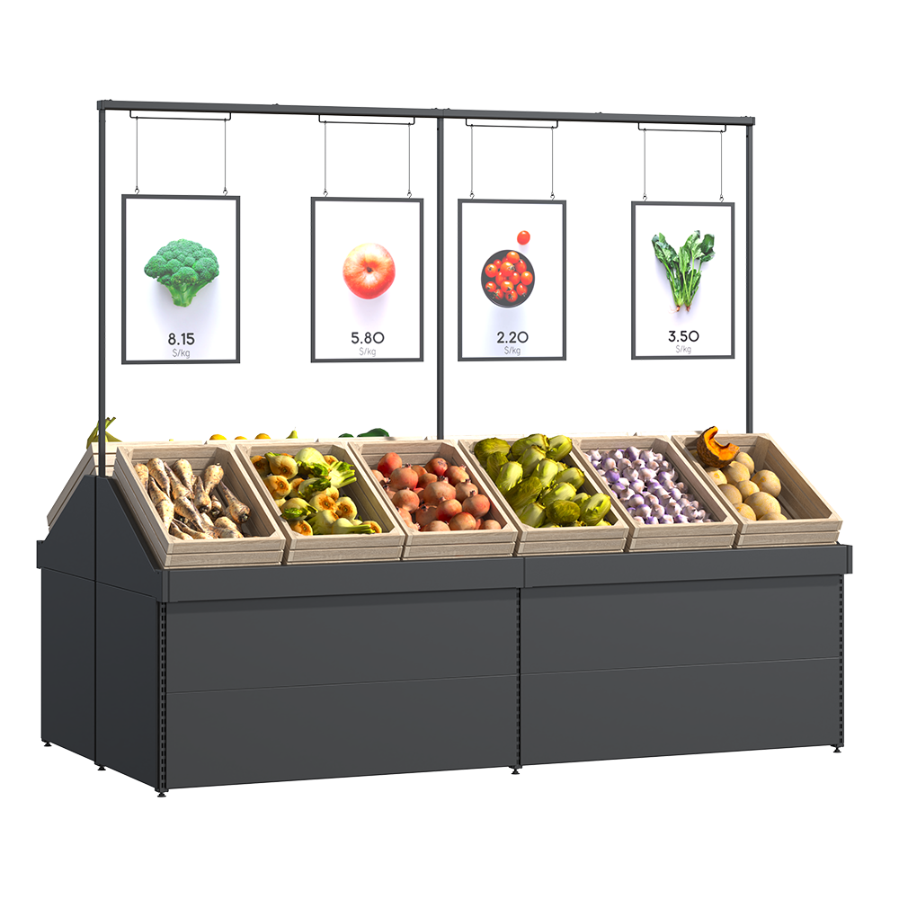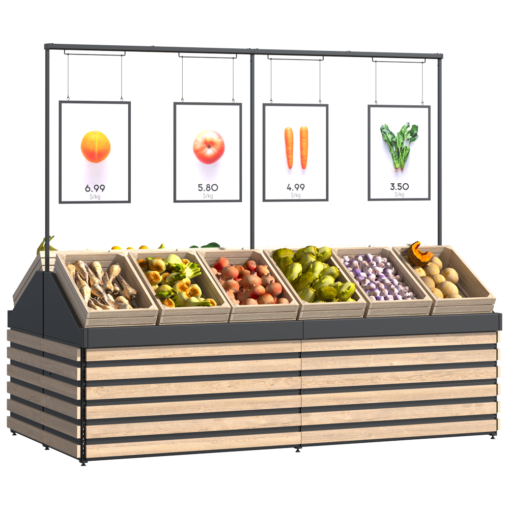 Gondola unit with top panel, designed for clear and attractive presentation of fruits and vegetables in commercial spaces. It features a durable metal frame, inclined shelves, particleboard finishes, a canopy for visual messaging and a front bumper bar. Compatible with standard wooden crates, this display is an ideal solution for space optimization in supermarkets and specialty stores, while also supporting effective promotional communication