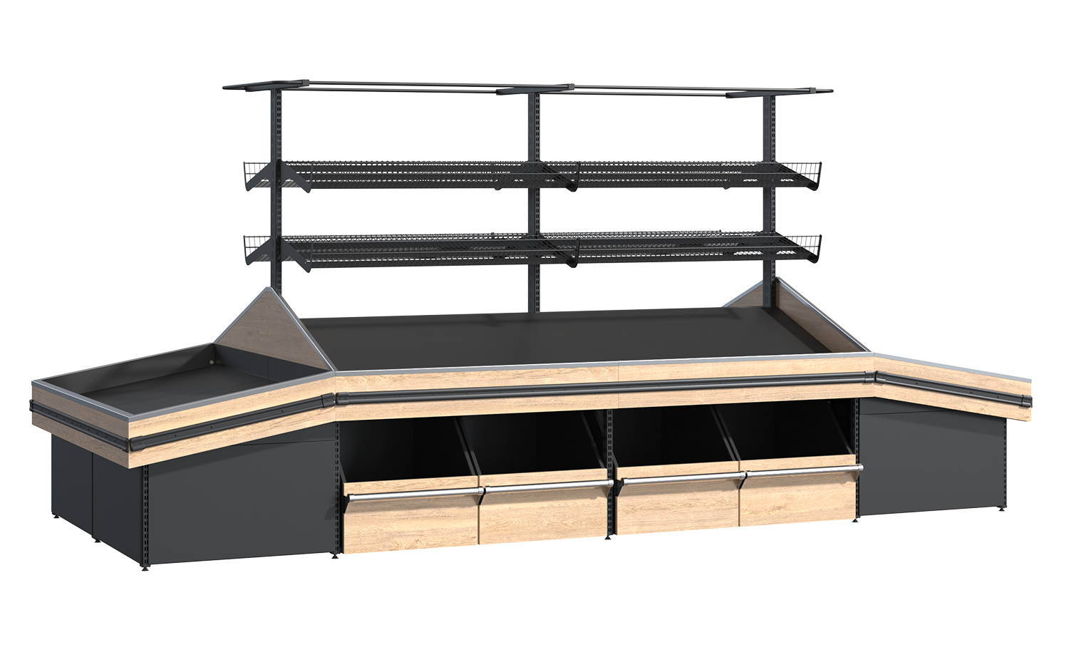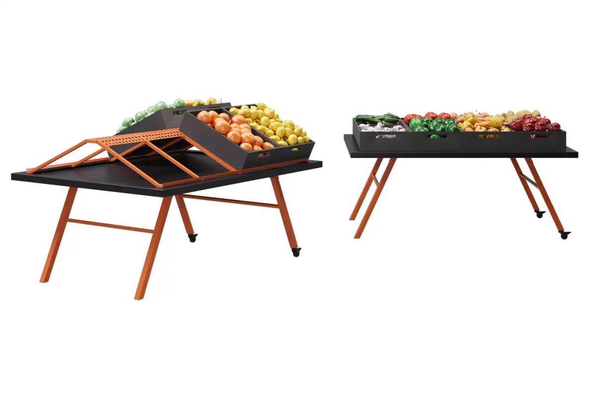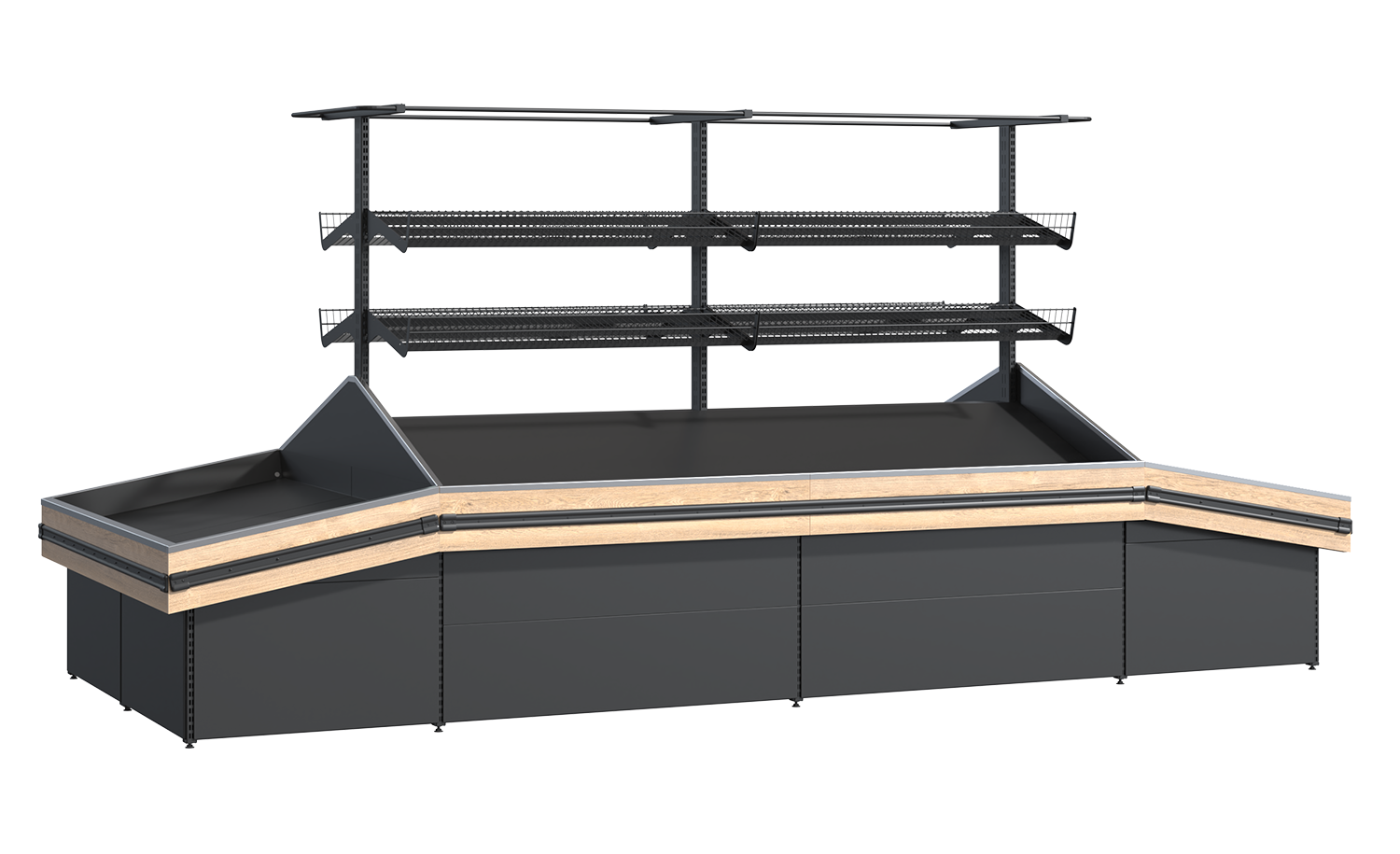Low-profile display platform with a two-level design, ideal for showcasing fruits, vegetables, and fresh products. Offers full 360° visibility, making it perfect for central or promotional areas in stores. Available with inclined or flat shelves made of wire, metal, or perforated material. Mobile or stationary configuration, easy to customize and rearrange. Supports foldable accessories for maximum efficiency and flexibility in retail.