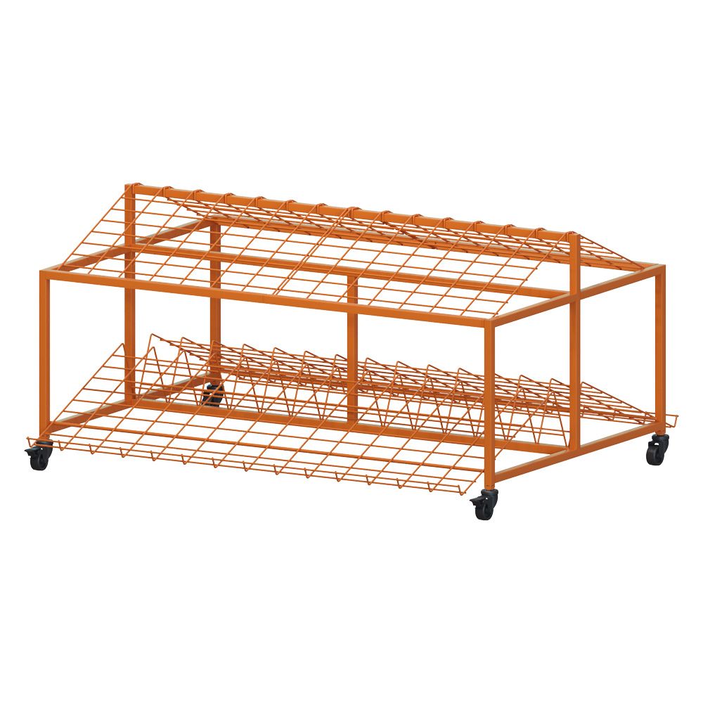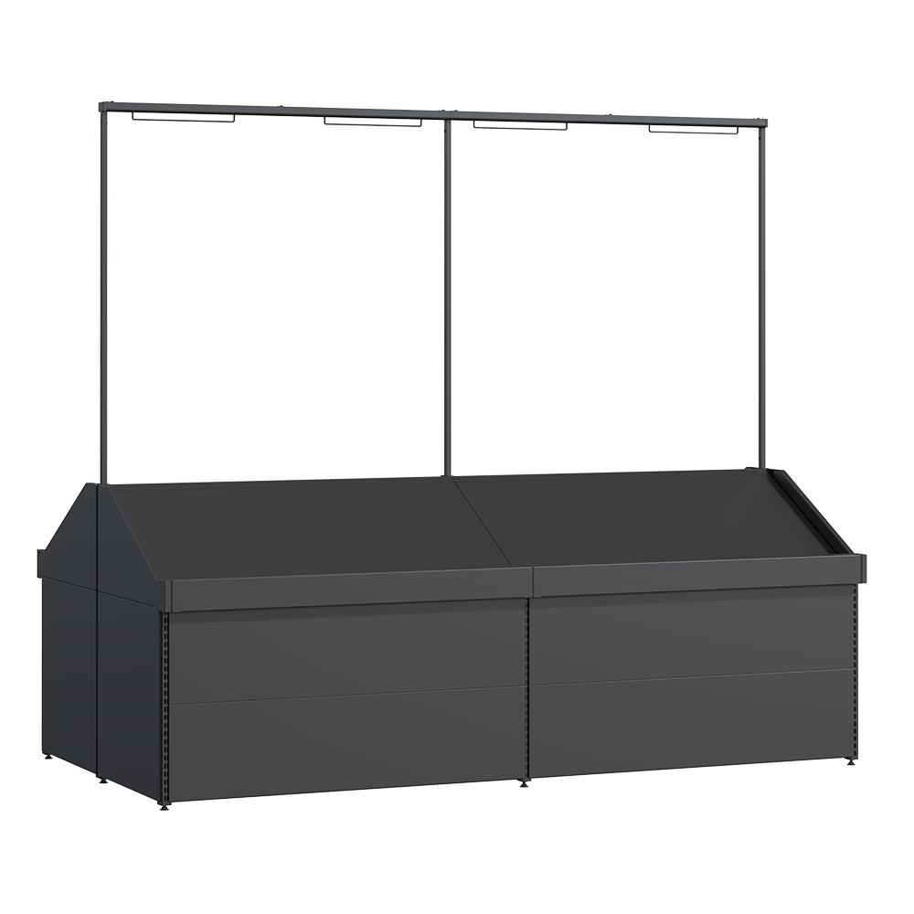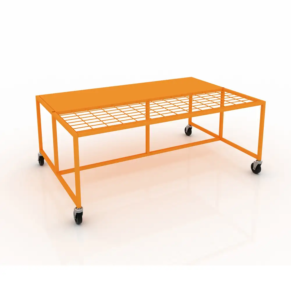 Low-profile display platform with a two-level design, ideal for showcasing fruits, vegetables, and fresh products. Offers full 360° visibility, making it perfect for central or promotional areas in stores. Available with inclined or flat shelves made of wire, metal, or perforated material. Mobile or stationary configuration, easy to customize and rearrange. Supports foldable accessories for maximum efficiency and flexibility in retail.