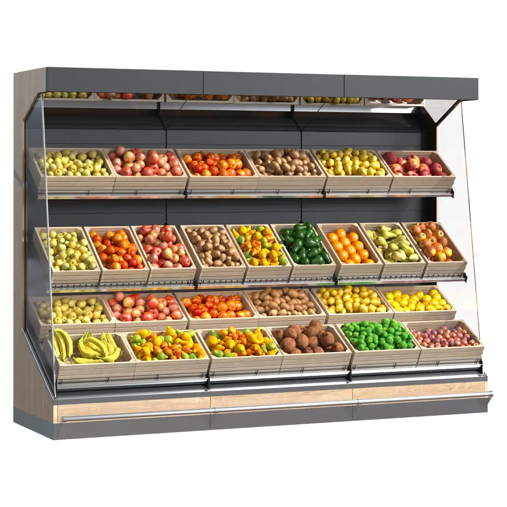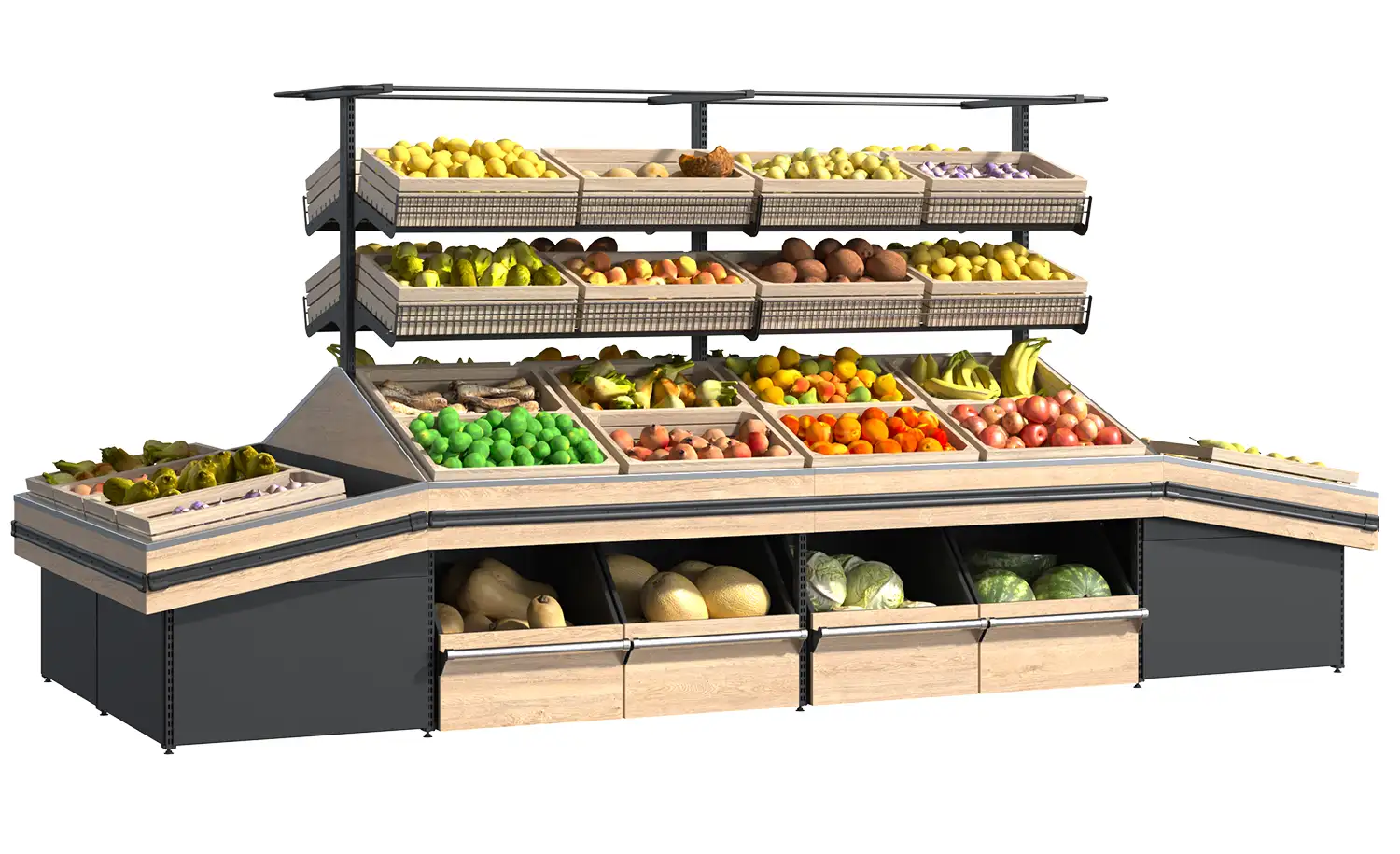 This professional gondola-style display is an ideal solution for showcasing fresh fruits and vegetables in supermarkets and grocery stores. It features multi-level presentation, foldable metal shelves, a sturdy frame, and decorative particleboard elements. Its modular design ensures clear and accessible product display. Compatible with standard wooden crates, the unit offers both functionality and a modern look for self-service areas.