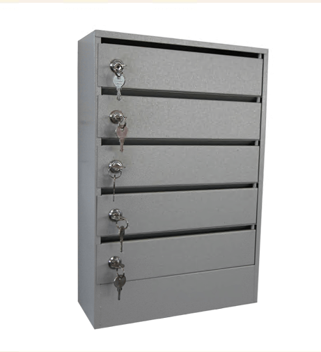 Ansamblu de cutii poștale pentru scări de bloc sau clădiri de birouri, cu 5 compartimente individuale.