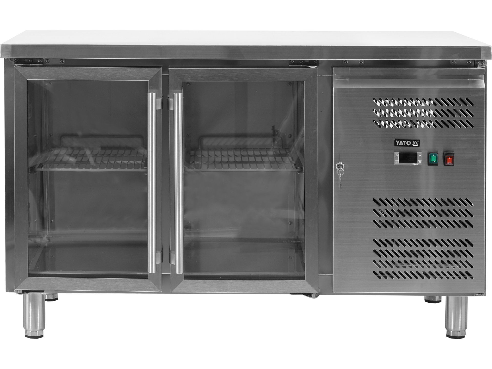 Dulap frigorific/vitrină pentru sticle YATO, cu 2 uși culisante din sticlă călită, capacitate 227 L, dimensiuni 920x515x905 mm și greutate 102 kg. Funcționează la 230 V / 200 W, cu interval de temperatură +2...+8 °C. Echipat cu 4 rafturi cromate (835x350 mm), iluminare LED 8 W și control electronic Dixell cu afișaj digital.