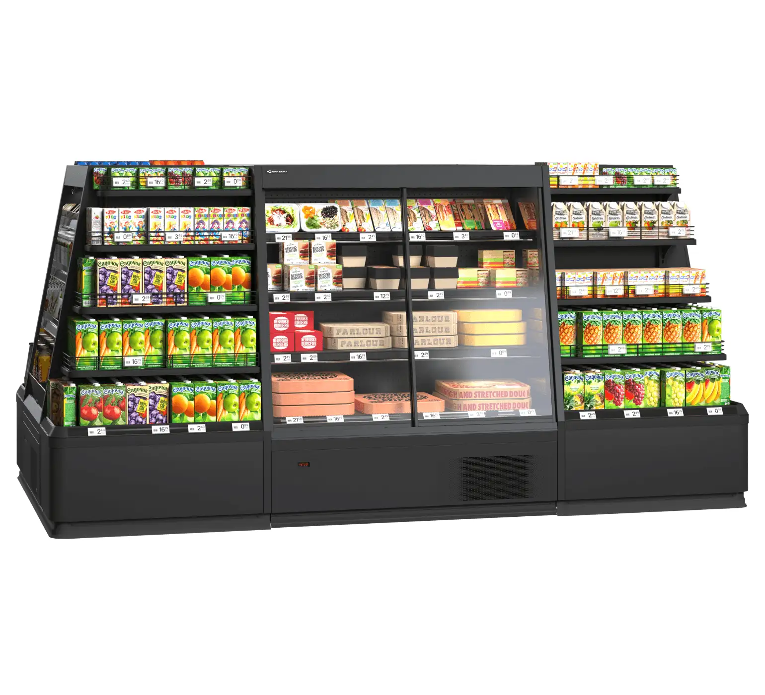 Vitrină frigorifică modernă pentru echipamente comerciale și frigorifice pentru retail. Fiabilă și eficientă energetic, echipată cu ventilatoare EC de înaltă tehnologie și sistem integrat de control. Universală pentru instalare: configurație liniară sau insulă, cu rafturi reglabile pe înălțime pentru alimente uscate și fructe FRUTTERA. Iluminarea LED superioară și pentru rafturi asigură o expunere luminoasă a produselor. Opțiuni suplimentare: cârlige pentru cârnați, iluminare LED verticală, panouri laterale oglinzi sau opace, precum și separatoare pentru o organizare eficientă în spațiile comerciale.