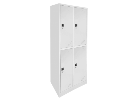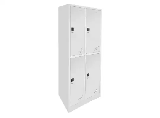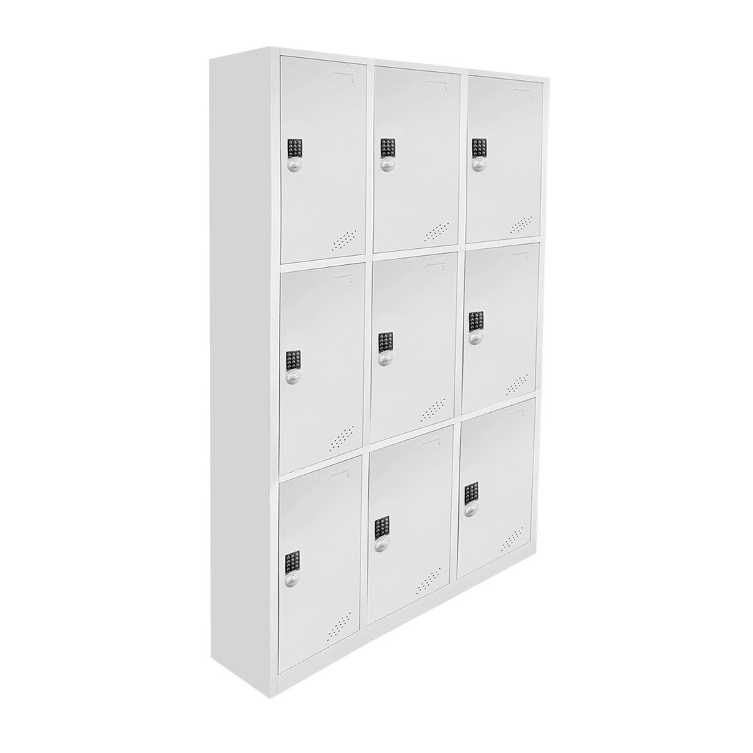 Металлический шкаф бело-серого цвета с 9 независимыми отделениями, предназначен для хранения сумок и одежды, идеально подходит для рабочих помещений, раздевалок или учебных заведений.
